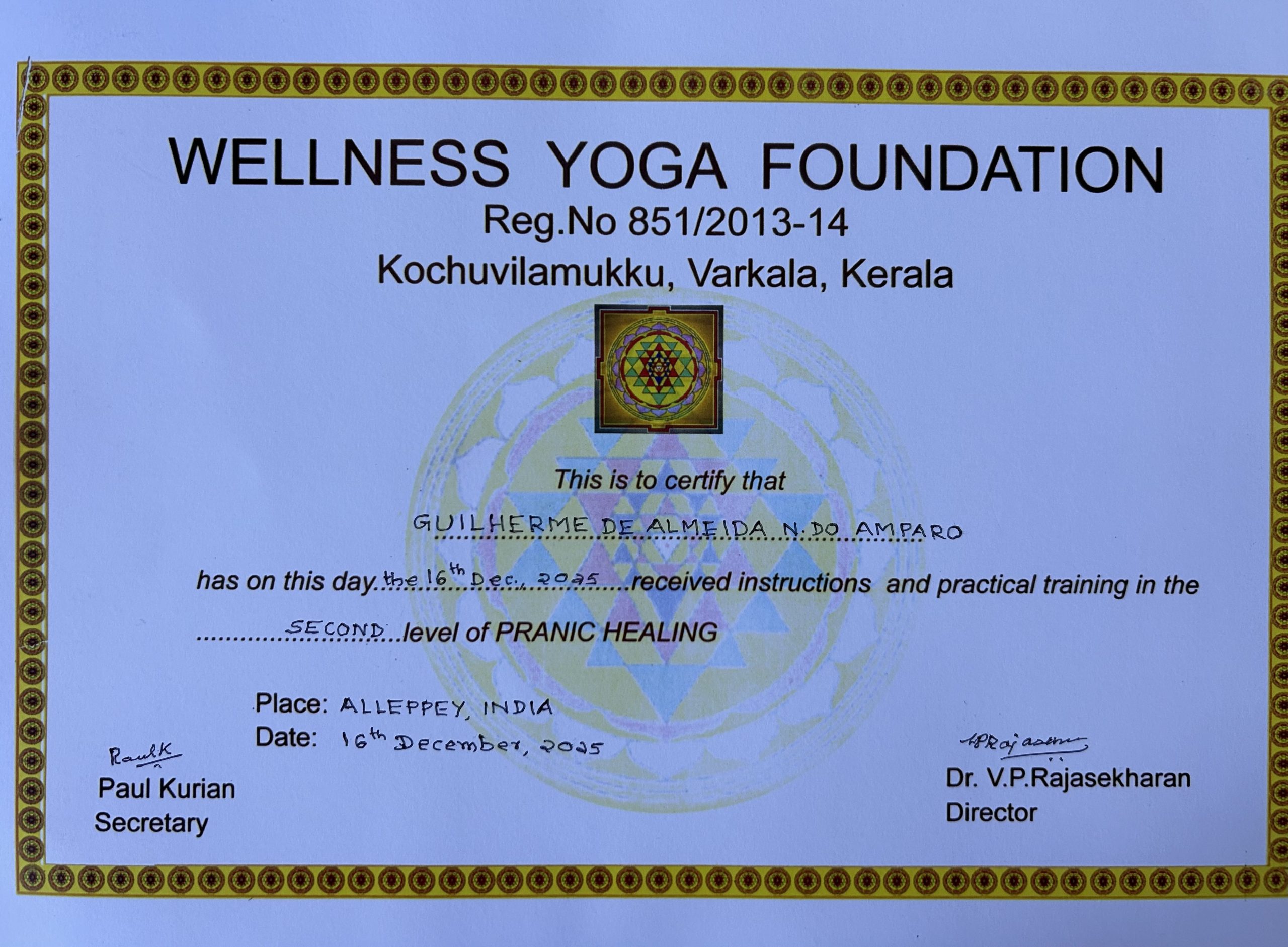 In 2025, I returned to India for an advanced period of study. In Rishikesh, I undertook advanced Hatha Yoga and Meditation training within a prestigious ashram, strengthening my command of traditional yogic principles and further refining my capacity to guide practitioners with discernment, authenticity, and compassion. During that same journey, I traveled to Kerala, where I completed my training as a Pranic Healing Practitioner, expanding my understanding of the energetic body and the role of prana in physical, emotional, and spiritual well-being.